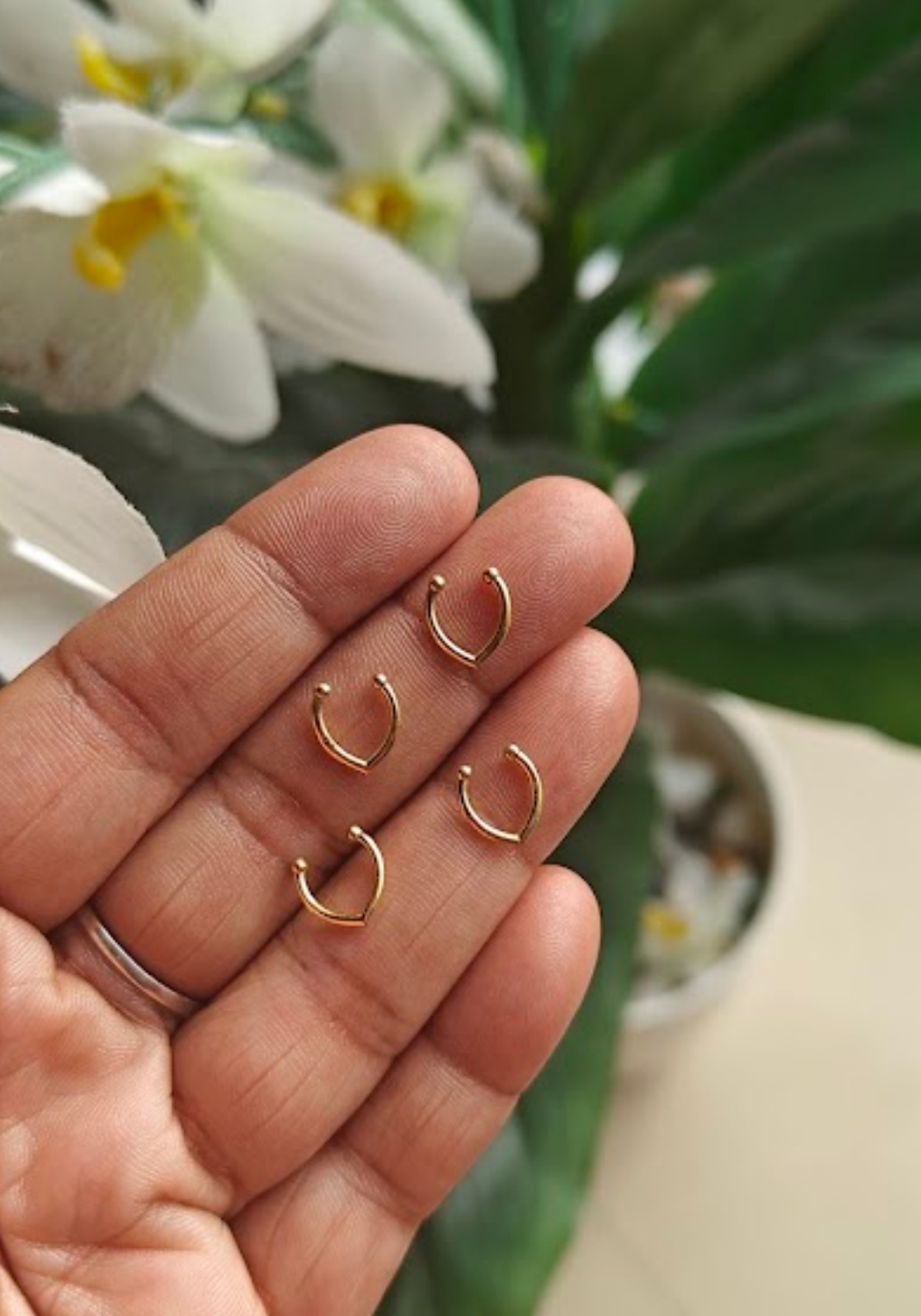 Gold plated septum ring for non pierced nose.